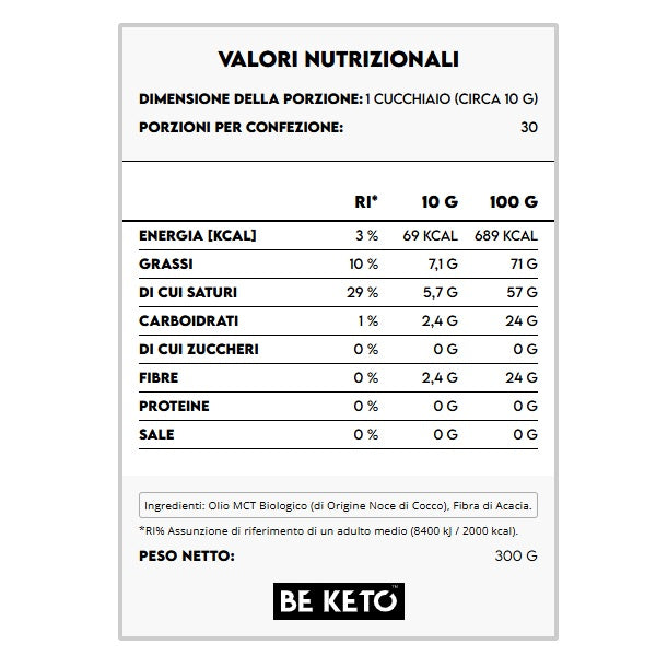 L’abbreviazione MCT sta per trigliceridi a catena media che vengono assorbiti più rapidamente rispetto ai trigliceridi a catena lunga (LCT) contenenti acidi grassi, hanno una funzione prevalentemente energetica e rappresentano in tal senso una via metabolica alternativa e/o complementare all'assunzione di zuccheri ed amidi, permettendo un risparmio di glicogeno, ma anche di aminoacidi a livello muscolare.Venditore: BE KETO