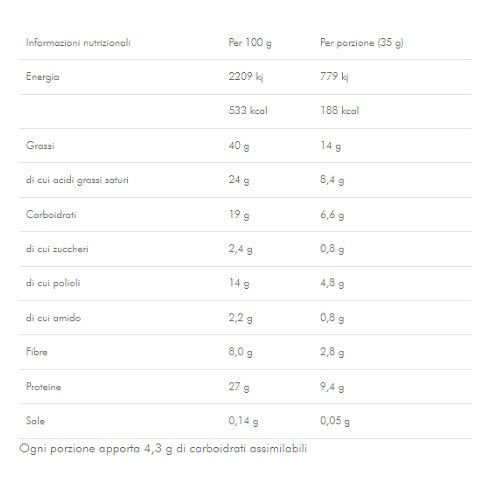 La tavoletta di cioccolato fondente Cioccolato Keto, grazie alla combinazione unica dei suoi ingredienti, fornisce un buon apporto proteico, con un ridotto tenore di zuccheri.