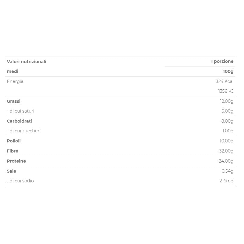 Proteine del siero del LATTE concentrate, albume d'UOVO, proteine del GRANO, fibra di FRUMENTO, proteine di pisello, fibra di acacia, olio di cocco, eritritolo, emulsionante: lecitina di girasole, e471, agenti lievitanti: bicarbonato di sodio, pirofosfato di sodio.