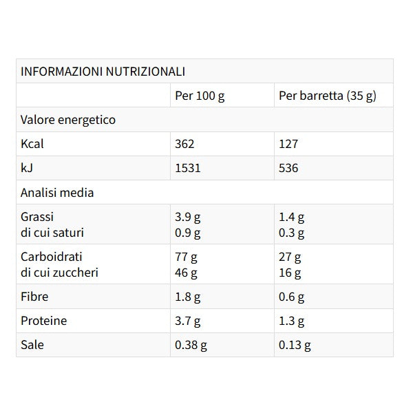 Crisp di riso (farina di riso, zucchero, sale), sciroppo di glucosio, semilavorato gusto caramello (zucchero, sciroppo di glucosio, acqua, panna fresca, latte intero in polvere, burro salato, fibre alimentari, sale, colorante: E150a, aromi) (12%), uva sultanina (12%), fiocchi di avena senza glutine, semilavorato di mela (zucchero, mela in polvere reidratata 22%, succo di mela (da concentrato) 18%, purea di mela 12%, fruttosio, acidificante: acido citrico, aromi) (9%), sciroppo di fruttosio, olio di girasole, °isomaltulosio, aromi, emulsionante: lecitina di soia, sale, estratto naturale d’oliva.°L’isomaltulosio è una fonte di glucosio e di fruttosio. Può contenere tracce di frutta a guscio, arachidi, sesamo.