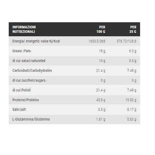 Gusto Cioccolato Fondente: Surrogato fondente [maltitolo, grassi vegetali non idrogenati (olio di cocco, burro di cacao), cacao magro 10/12 (min 20 %), emulsionante: lecitina di soia, aromi], proteine idrolizzate del siero del latte (Optipep 90 ist. DH4 prodotte da Carbery), estruso proteico isolato del latte, L-Glutammina, Kyowa Quality®.