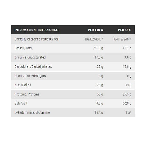 Prima ed unica barretta sul mercato contenente esclusivamente il 100% di proteine Optipep 90 inst. DH4 prodotte da Carbery con L-Glutammina 100% Kyowa Quality® e zero zuccheri. La proteina utilizzata è infatti costituita al 100% da proteine irlandesi idrolizzate Optipep 90% prodotte da Carbery, leader mondiale nella produzione di proteine del latte idrolizzate, che permettono di ottenere piccole frazioni di peptidi per processi di digestione enzimatica con un elevato apporto di L-Leucina. Questi vengono così assorbiti rapidamente dall’organismo apportando aminoacidi essenziali per la crescita e mantenimento della massa muscolare. Oltre ad apportare ben 27,5 g di pure proteine idrolizzate la barretta contiene zero zuccheri (100 mg nella versione crunchy), 1 grammo di pura glutamina Kyowa Quality® ed è disponibile in 4 favolosi gusti delicati e croccanti. Indicata sia come come snack che come spuntino pre o post allenamento inserito in un regime dietetico iperproteico.