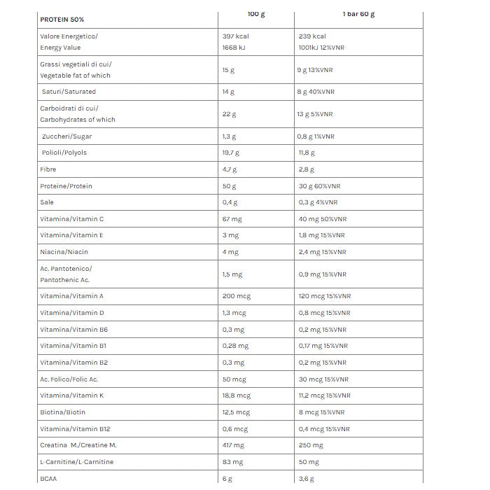 Barretta proteica con il 50% pari a 30 g di proteine del latte con il più alto valore biologico; Promeal Protein 50 ha tutti gli aminoacidi essenziali nelle proporzioni ottimali, aminoacidi ramificati (BCAA), una base vitaminica completa, ingredienti altamente energetici come carnitina, ornitina e creatina che la rendono un prodotto unico sul mercato. La barretta proteica Promeal Protein 50 ha una composizione adatta anche a chi non tollera il glutine o il lattosio ed è priva di grassi idrogenati e di coloranti artificiali. Promeal Protein 50 è indicata nelle fasi di preparazione agonistica in cui si richiede la massima definizione muscolare e dopo gli allenamenti nelle fasi di recupero