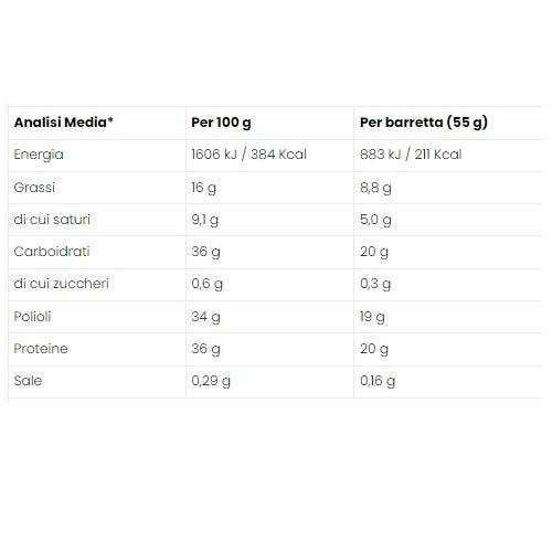Cioccolato di copertura al latte con edulcorante (33%) (edulcorante: maltitoli, latte intero in polvere, pasta di cacao, siero del latte in polvere, emulsionante: lecitine) - Proteine del latte (21%) - Edulcorante: maltitoli - Collagene idrolizzato (8,2%) - Umidificante: glicerolo - Fiocchi di soia (5,0%) - Burro di cacao - Proteine di soia (3,1%) - Olio di girasole - Agente di carica: polidestrosio - Proteine del latte in fiocchi (1,5%) - Edulcorante: sorbitoli - Granella naturale di nocciole (1%) - Cacao magro (1%) - Aroma naturale - Emulsionante: lecitine. Può contenere tracce di altra frutta a guscio, arachidi, semi di sesamo. AVVERTENZE: Un consumo eccessivo può avere effetti lassativi.