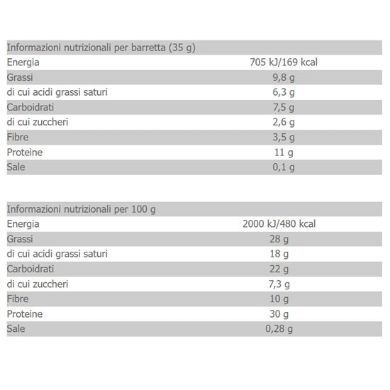 - Basso contenuto di carboidrati (7,6 g per barretta)