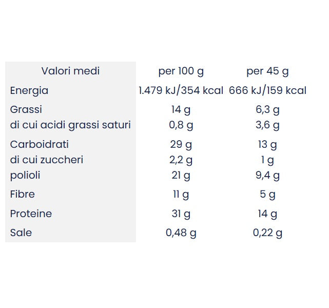 La barretta proteica da 45 g presenta un profilo nutrizionale equilibrato, particolarmente indicato per chi cerca un alimento a basso contenuto di zuccheri ma ricco di proteine. Con 5,0 g di fibre per barretta contribuisce al mantenimento di una buona salute intestinale e alla sensazione di sazietà.