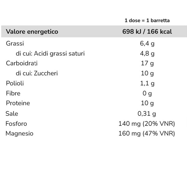 Barretta proteica da 40g con fosforo e magnesio ricoperta di glassa al latte.