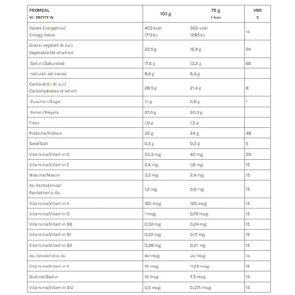 Proteine del latte, cioccolato fondente - cacao minimo 54% (pasta di cacao, edulcorante: maltitolo, burro di cacao, emulsionante: lecitina di soia, aroma), sciroppo di fruttooligosaccaridi, grassi vegetali (cocco, extravergine di oliva, mais), proteine di soia; frutta a guscio: pistacchi (nel gusto pistacchio), nocciole (Corylus avellana) (nel gusto nocciola), arachidi (nel gusto peanut), umettante: glicerina vegetale E422, maltodestrine di mais, aroma, vitamina C (acido L-ascorbico), magnesio carbonato, edulcorante: sucralosio E955, potassio cloruro, vitamina E (DL-alfa tocoferolo), niacina (nicotinamide), ferro solfato, calcio D-pantotenato, vitamina A (retinil palmitato), zinco solfato, vitamina D (colecalciferolo), vitamina B6 (piridossina cloridrato), vitamina K (fillochinone), vitamina B1 (tiamina cloridrato), vitamina B2 (riboflavina), acido folico, D-biotina, vitamina B12 (cianocobalamina).