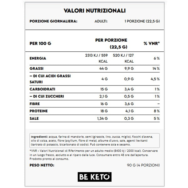 Acqua, farina di mandorle, semi (girasole, lino, zucca, miglio), fiocchi d’avena, olio di colza, aceto, fibre (psyllium, fibre di mela), albume d’uovo, sale, agenti lievitanti (tartrato di potassio, bicarbonato di sodio). Può contenere soia e sesamo.