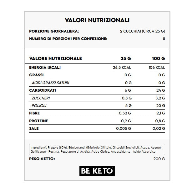 Fragole (60%), Edulcoranti: (Eritritolo, Xilitolo, Glicosidi Steviolici), Acqua, Agente Gelificante - Pectina, Regolatore di Acidità: Acido Citrico, Antiossidante - Acido Ascorbico.