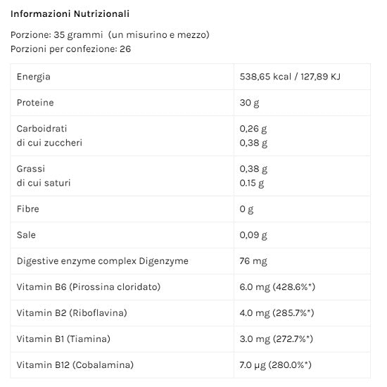 Proteine del siero di latte isolate idrolizzate, (Carbery® Optipep® 90DH4); edulcoranti naturali (eritritolo, glicosidi steviolici), aromi, complesso di enzimi digestivi Digezyme®, piridossina cloridrato (vitamina B6), cianocobalamina (vitamina B12), riboflavina (vitamina B2), tiamina (vitamina B1).