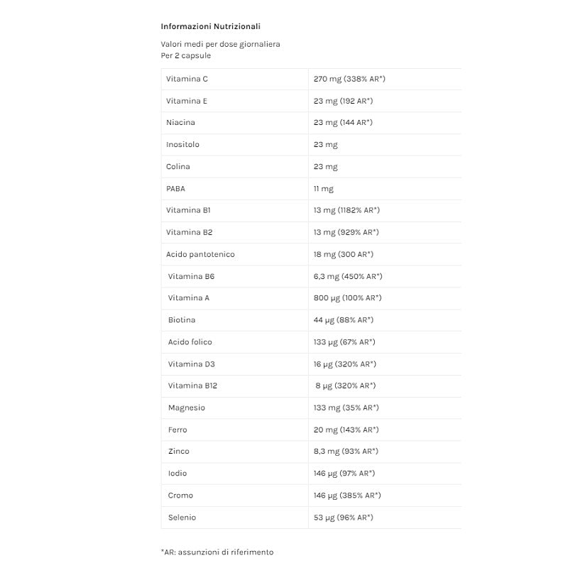 In particolare, le vitamine B1, B2, B6, B12, l’acido pantotenico, la biotina, il ferro, lo iodio, il magnesio e la niacina supportano il normale metabolismo energetico, mentre l’acido folico e le vitamine C, B2, B6, B12 contribuiscono alla riduzione della stanchezza e dell’affaticamento.