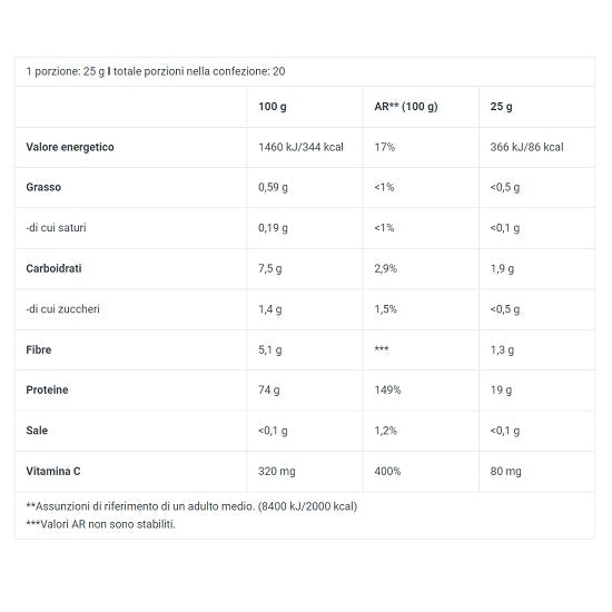 Bevanda in polvere aromatizzata a base di proteine del siero di latte isolate con zuccheri, edulcorante, fibre di agrumi e vitamina C aggiunta.
