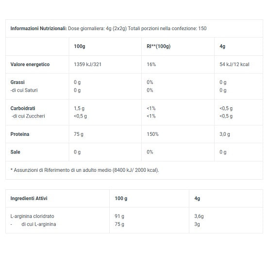 L'arginina è un aminoacido prodotto nella ghiandola pituitaria e fa parte degli aminoacidi non essenziali anche se in particolari condizioni come lo stress o il duro lavoro fisico il corpo può non essere in grado di produrne in quantità sufficiente (diventa un aminoacido condizionatamente essenziale) e quindi l'integrazione con prodotti di alta qualità è una pratica benefica e consigliata.