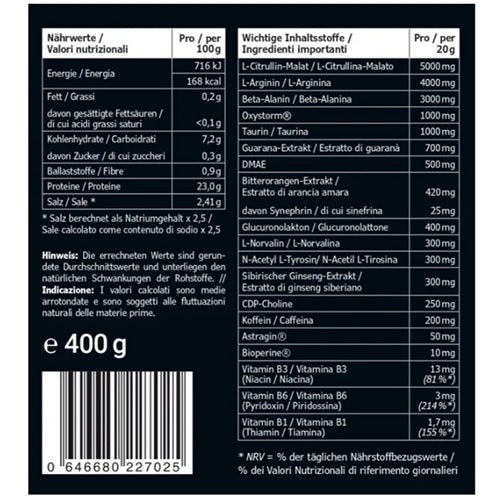Black Focus Pro 3.0 è il pre-workout che contiene ingredienti chiave alla massima concentrazione legalmente consentita, inclusi composti utilizzati principalmente negli Stati Uniti. La formula è studiata per combinare in modo sinergico ingredienti che aumentano il flusso sanguigno, la resistenza, la forza e la concentrazione — ottimizzando le tue performance durante l’allenamento..