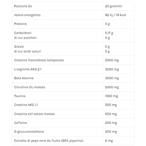 Cluster dextrine, beta-alanina, L-arginina (AKG 2:1), creatina monoidrato tamponata (creatina monoidrato regolatore di acidità: bicarbonato di sodio, bicarbonato di calcio, fosfato di calcio bibasico, sodio fosfato bibasico, potassio fosfato bibasico); regolatore di acidità: acido citrico, L-citrulina DL malato, taurina, creatina (AKG 1:1), creatina etil estere malato; antiagglomeranti: (biossido di silicio, tricalcio fosfato), caffeina anidra, D-glucuronolattone, aromi; colorante: (estratto di paprika), edulcoranti: sucralosio, acesulfame K, estratto di pepe nero.