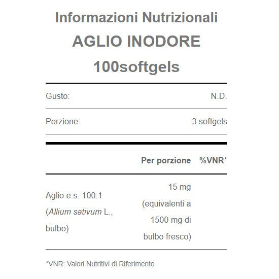 Aglio inodore di Jamieson è un integratore a base di aglio (Allium sativum L.), pianta erbacea appartenente alla famiglia delle Liliaceae. Conosciuto anche con l’appellativo di “antibiotico naturale”, l’aglio presenta molteplici proprietà benefiche e una delle sostanze più importanti contenute in esso è l’allicina, che gli conferisce proprietà antibiotiche e antibatteriche. Ha proprietà antiossidanti, utili per contrastare l’azione dei radicali liberi, contribuisce alla funzionalità cardiovascolare, alla regolarizzazione della pressione arteriosa e interviene nel metabolismo dei trigliceridi e del colesterolo. Inoltre è un valido alleato contro i sintomi del raffreddore. L’aglio inodore di Jamieson contiene aglio ultra puro filtrato a freddo tramite un processo chiamato “metodo veloce di essiccazione” attraverso il quale l’odore viene eliminato senza denaturare i principi attivi.