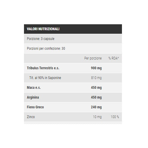 Tonico maschile, antiastenico e sostegno metabolico. Integratore a base di Tribulus terrestris tit 90%, arginina, fieno greco e maca.Venditore: Pro Nutrition
