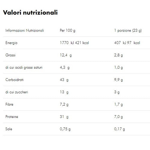 Fiocchi di soia proteici multicereale (33%) (proteine isolate di soia (19% sul prodotto finito), farina di riso, farina integrale di avena, farina d’orzo, sciroppo di riso) - Riccioli di cioccolato fondente (17%) (zucchero, pasta di cacao, burro di cacao, burro anidro (da latte), cacao magro in polvere, emulsionante: lecitine (da soia)) - Fiocchi di avena (11%) - Granella di nocciole pralinata (11%) (nocciole (6,6% sul prodotto finito), zucchero) - Fiocchi di farro (10%) - Proteine concentrate di soia (6%) - Fiocchi di avena al cacao (6%) (fiocchi di avena (4,5% sul prodotto finito), oligofruttosio, cacao in polvere, olio di girasole ad alto contenuto di acido oleico) - Riso soffiato caramellato (6%) (riso, zucchero). Può contenere tracce di uova, altra frutta a guscio. Il prodotto va utilizzato nell’ambito di una dieta variata ed equilibrata e uno di stile di vita sano.
