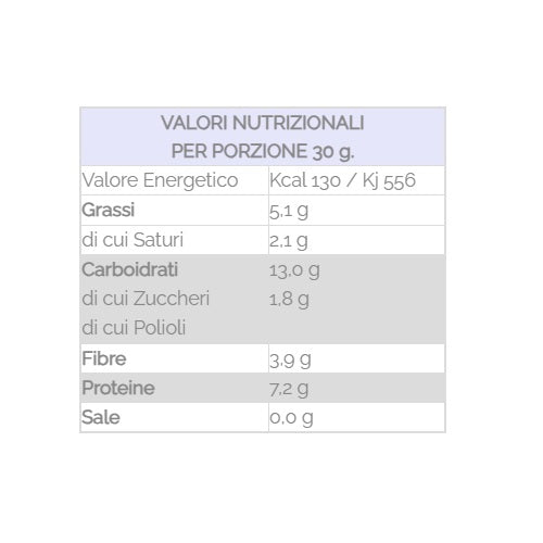 Fiocchi di AVENA Integrale, Farina di Riso, Riso Soffiato, Estruso di Pisello Proteico, Estruso di Riso, Burro di Cacao, Sciroppo di Riso, NOCCIOLE Intere 6%, Miele Millefiori, Fibre Vegetali : Frutto Oligo Saccaridi, Cubetti di Cioccolato Fondente 3%(Zucchero, Cacao, Burro di Cacao, Lecitina di SOIA ), Aroma Naturale di Vaniglia.