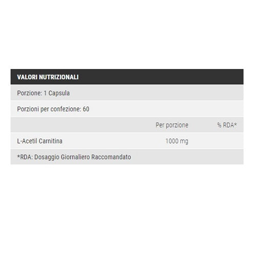 Integratore alimentare per sportivi a base di Acetil L-Carnitina. La carnitina favorisce la produzione di energia per la cellula veicolando gli acidi grassi nelle sedi deputate alla loro utilizzazione metabolica favorendo il metabolismo dei grassi.