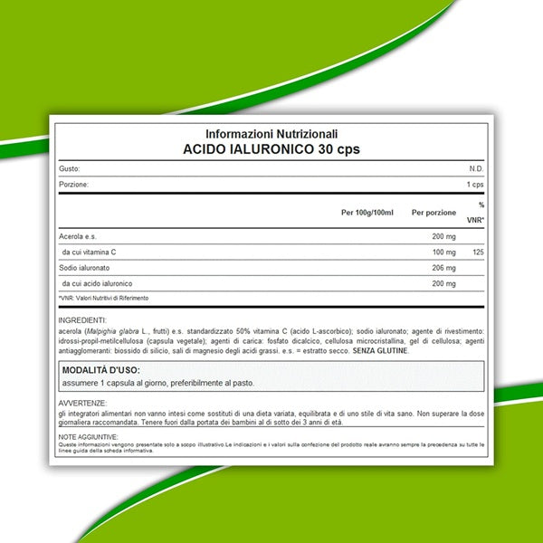 Acerola (Malpighia glabra L., frutti) e.s. standardizzato 50% vitamina C (acido L-ascorbico); sodio ialuronato; agente di rivestimento: idrossi-propil-metilcellulosa (capsula vegetale); agenti di carica: fosfato dicalcico, cellulosa microcristallina, gel di cellulosa; agenti antiagglomeranti: biossido di silicio, sali di magnesio degli acidi grassi. e.s. = estratto secco. SENZA GLUTINE.