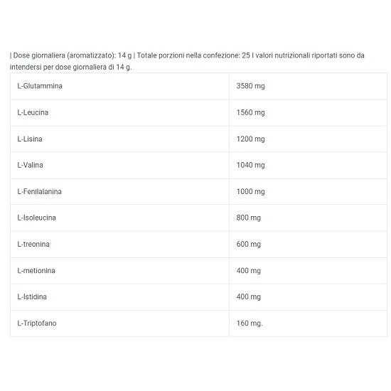 Gusto Limone : L-Glutammina (25,6%), L-Leucina Istantanea (11,4%) (L-Leucina, Emulsonante: Lecitina, Maltodestrine), L-Lisina Cloridrato (10,7%), Acidificante: Acido Citrico, Aroma (Limone), L-Valina (7,4%), L-Fenilalanina * (7,1%), L-Isoleucina (5,7%), L-Treonina (4,3%), L-Istidina Cloridrato (3,5%), L-Metionina (2,9%), L-Triptofano (1,1%), Edulcorante (Sucralosio). * Contiene Fenilalanina.