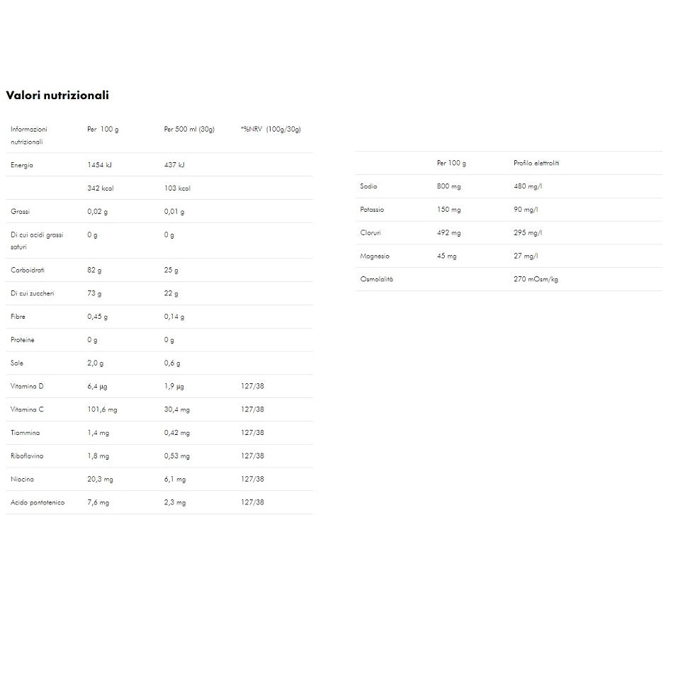 Saccarosio (37,7%) - Destrosio (24,5%) - Fruttosio (12%) - Mix di maltodestrine a differente grado di polimerizzazione (Maltodestrina DE2, maltodestrina DE6 e maltodestrina DE19) (6%) - Gluconato di sodio - Acidificante: acido citrico - Aromi - Amido di riso (3%) - Succo d’arancia concentrato in polvere (1%) - Gluconato di potassio - Cloruro di sodio - Addensante: carbossimetilcellulosa sodica - Magnesio citrato bibasico - Agente antiagglomerante: biossido di silicio - Coloranti: estratto di paprica, beta carotene - Acido L-ascorbico - Nicotinamide - Calcio D-Pantotenato - Riboflavina - Cloridrato di tiamina - Colecalciferolo. Può contenere tracce di soia, latte, uova.