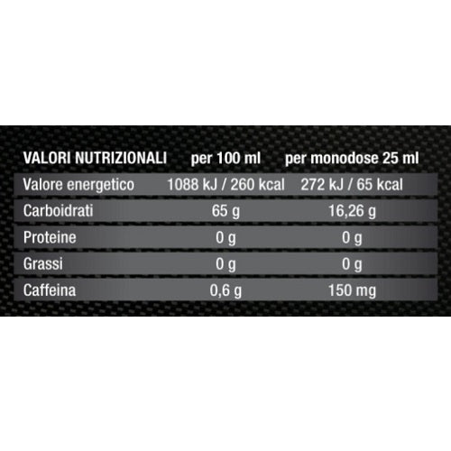 GEL con alto tenore di Caffeina 25 ml Maltodestrine selezionate e caffeina 150 mg Per prestazioni costanti e regolari senza picchi glicemiciSpedizione GRATIS da 29,90 euro
