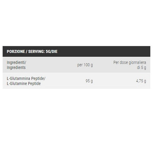 La formulazione di GLUTAMMINA PEPTIDE (costituita da due peptidi L-alanil L-glutammina e L-glicil-L-glutammina) si differenzia dagli integratori a base di sola glutammina cloridrato per la maggiore solubilità e stabilità in acqua e il maggiore assorbimento della glutammina utilizzata. La Glutamina è uno degli aminoacidi maggiormente presenti nel tessuto muscolare (viene quindi facilmente depauperato durante intensi sforzi e la sua richiesta aumenta in condizioni di stress psicofisico). Per questi motivi è molto utilizzata nella dieta degli sportivi che richiedono recupero muscolare, azione anticatabolica, azione antiossidante e potenziamento del sistema immunitario.