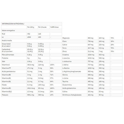 Recupero è un prodotto per sportivi che apporta nutrienti con diverse funzioni utili nella fase successiva alla attività sportiva. Le vitamine e gli oligoelementi contenuti svolgono numerose funzioni, in particolare contribuiscono alla riduzione della stanchezza e dell’affaticamento (Vit B2, B3, B5, B6, B12, C, Folato, Ferro), contribuiscono al normale metabolismo energetico (Vit B1, B2, B3, B5, B6, B12, C, Biotina, Calcio, Magnesio, Ferro) delle proteine e del glicogeno (vit B6) e alla regolare funzione muscolare (Ca, Mg, K). Gli ingredienti contenuti coadiuvano anche altre funzioni, in particolare contribuiscono alla fisiologica sintesi proteica (Mg e Zn), alla normale funzione cardiaca (B1) e alla regolare sintesi degli amminoacidi (folato). Altri ingredienti contribuiscono alla regolare formazione dei globuli rossi (vit B6, Fe), al normale trasporto di ossigeno (Fe), alla corretta neurotrasmissione (Ca), al regolare equilibrio elettrolitico (Mg) e alla protezione delle cellule dallo stress ossidativo (Vit C, B2, Zn). Apporta inoltre B.C.A.A. indicati nella dieta dello sportivo.