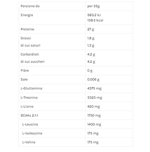 Concentrato di proteine del siero di latte ,isolato di proteine del siero di latte (isolac®) L-glutamina, L-treonina ,cacao magro in polvere, BCAA 8:1:1 (L-leucina, L-isoleucina, L-valina), L-lisina, aroma, edulcoranti: (sucralosio, acesulfame k)