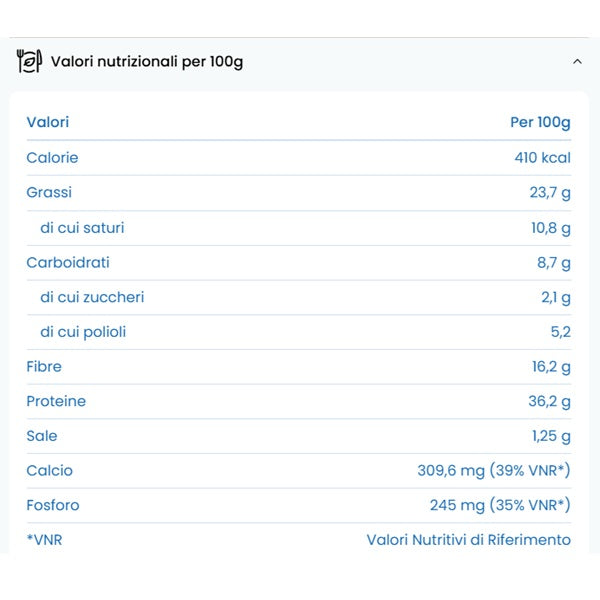 Cioccolato fondente 13,6% (fibra vegetale, proteina vegetale (cacao), burro di cacao, cacao magro in polvere, emulsionanti: lecitina di girasole E322, poliglicerolo poliricinoleato E476, edulcoranti: sucralosio E955, acesulfame E950, antiossidante: tocoferolo acetile E307), umettanti (polidestrosio E1200, glicerina E422), farina di MANDORLE, BURRO (contiene LATTE), proteina di SOIA, collagene idrolizzato, proteina del LATTE, polvere d’UOVO (tuorlo e albume), granella di NOCCIOLE tostate 3,8%, aromi, cacao magro 2,7%, agenti lievitanti (pirofosfato acido di sodio E450i, bicarbonato di sodio E500, amido di mais), conservanti (sorbato di potassio E202, propionato di sodio E281), sale, edulcorante: sucralosio E955.