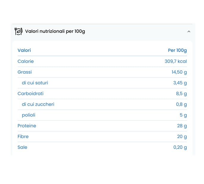 amido resistente di tapioca, proteine del GRANO, proteina del pisello, BURRO (deriva da LATTE), tuorlo d’UOVO, inulina, edulcorante: eritritolo, crema vaniglia 3% (edulcorante: maltitolo, tuorlo d’UOVO, LATTE in polvere scremato, succo di limone, amido modificato), malto d’orzo diastasico, semi di lino, semi di girasole decorticato, semi di SESAMO, sale, lievito di birra, conservante: sorbato di potassio.