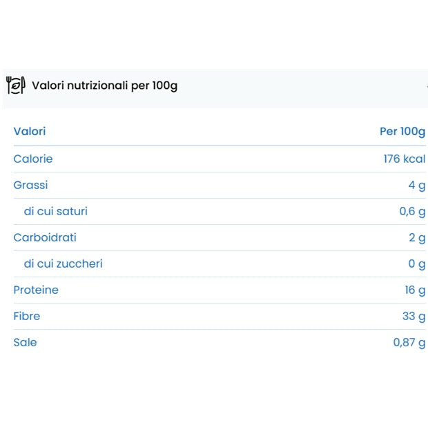 Amido resistente di tapioca, proteine del GRANO, proteina del pisello, olio extravergine di oliva, lievito di birra, sale, conservante: sorbato di potassio.