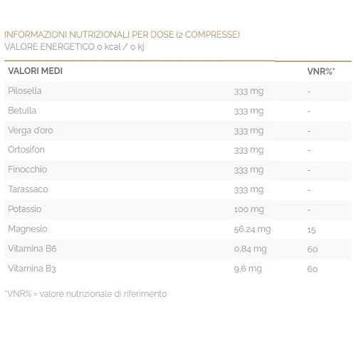 Betulla Foglia (Betula Pendula Roth e.s. 2.5% Iperoside), Pilosella Erba (Hieracium Pilosella L. e.s. 1% Vitexina), Orthosiphon Foglia (Ortosiphon Stamineus Benth e.s. 0,1% in Sinensetina), Finocchio Frutti Polvere (Faeniculum Vulgare Mill. e.s. ¼), Tarassaco Radice Polvere (Taraxacum Officinale Weber e.s. ¼), Verga D’oro Sommità Fiorite Polvere (Solidago Virga-Aurea L. e.s. ¼), Potassio Cloruro, Magnesio Carbonato, Vitamina B3 (Niacina), Vitamina B6 (Piridossina). Stabilizzanti: Polivinilpirrolidone, Magnesio Stearato Vegetale, Silicio Biossido.