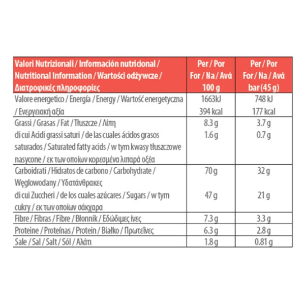 Assumere 1 barretta circa 60–90 minuti prima dell’attività, accompagnata da acqua.