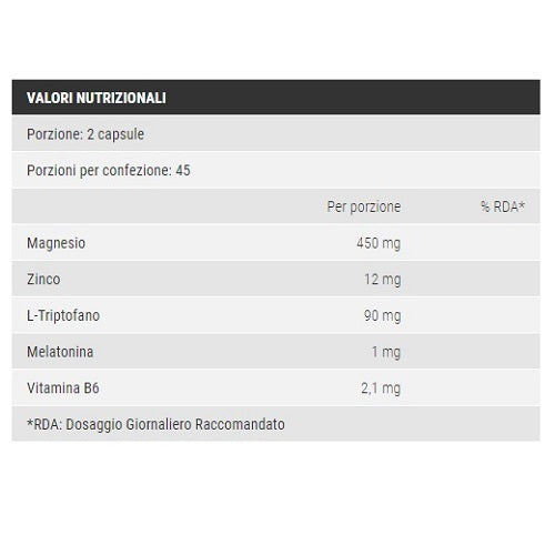 Prodotto a base di Magnesio, zinco, melatonina e triptofano utile per il miglioramento dle ritmo sonno veglia e per i momenti di maggiore stress fisico. Evoluzione del precedente ZMA arricchito con melatonina e L-triptofano. Contiene zinco, magnesio e vitamina B6 utili per la loro azione di recupero muscolare mentre l’aggiunta di melatonina e L-triptofano contribuiscono a favorire il riposo notturno e migliorare decisamente il ritmo sonno-veglia. Soluzione ideale per i periodi di stress psico fisico, astenia e difficoltà nel recupero dell’energia ed equilibrio dell’organismo.