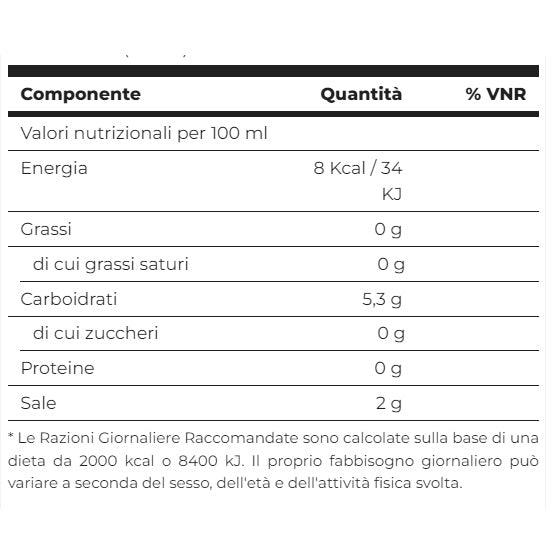 acqua, edulcorante (eritritolo e sucralosio), aceto di alcol, fibra vegetale, stabilizzante (gomma di xanthan), aromi, acidificante (acido lattico), conservante (benzoato di sodio), sale e coloranti (caramello solfito-ammoniacale).
