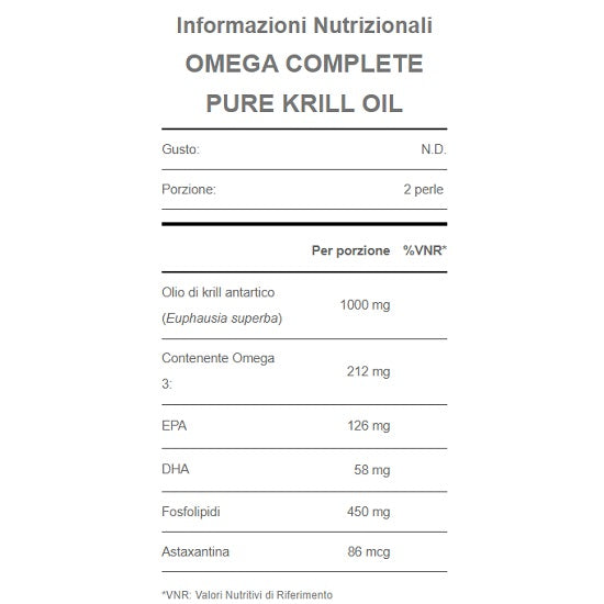 Omega complete pure krill oil contiene al 100% puro olio di krill antartico (Euphausia superba), piccolo crostaceo presente in enorme quantità in termini di biomassa nell’Antartico. L’olio di krill antartico è un tipo di krill particolarmente abbondante e rinnovabile, raccolto con una pesca sostenibile nelle gelide e profonde acque dell’Antartico. Il krill è una fonte particolarmente pregiata e altamente biodisponibile di EPA e DHA (acidi grassi Omega-3) e di astaxantina. L’astaxantina è un carotenoide con un forte potere antiossidante che contribuisce alla protezione delle cellule dai danni dei radicali liberi. L’olio di krill Jamieson è privo di metalli pesanti, PCB (policlorobifenile, inquinante ambientale), diossina e pesticidi. Omega complete pure krill oil non presenta il fastidioso retrogusto di pesce in bocca che spesso accompagna gli integratori di olio di krill.