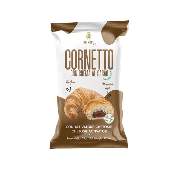 Cornetto Keto di Dr. Keto ripieno di crema al cacao, con soli 5gr. di carboidrati a 0,6 gr. di zuccheri, ideato per una colazione perfetta durante una dieta chetogenicaSpedizione GRATIS da 29,90 euro