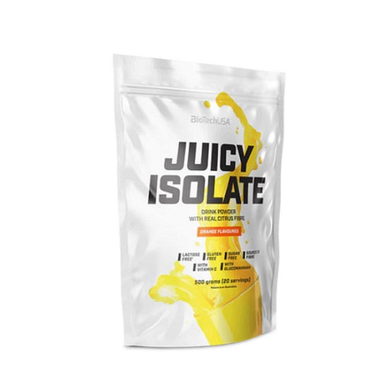 Juicy Isolate, il tuo succo di arancia! Bevanda in polvere aromatizzata a base di proteine del siero di latte isolate con zuccheri, edulcorante, fibre di agrumi e vitamina C aggiunta.