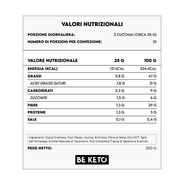 Keto Crema di Noci Pecan & Caramello Salato con olio MCT è una crema di noci pecan di altissima qualità, completamente consentita nella dieta keto e low-carbSpedizione GRATIS da 29,90 euro