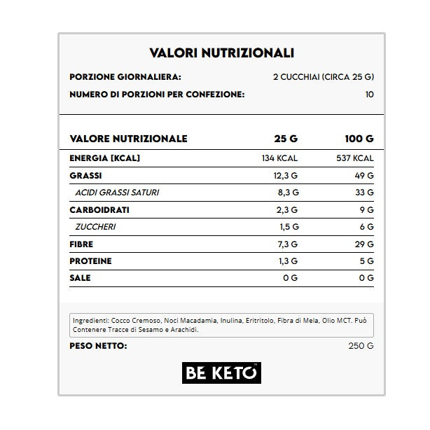 Cocco olio, Noci Macadamia, Inulina, Eritritolo, Fibra di Mela, Olio MCT. Può Contenere Tracce di Sesamo e Arachidi.