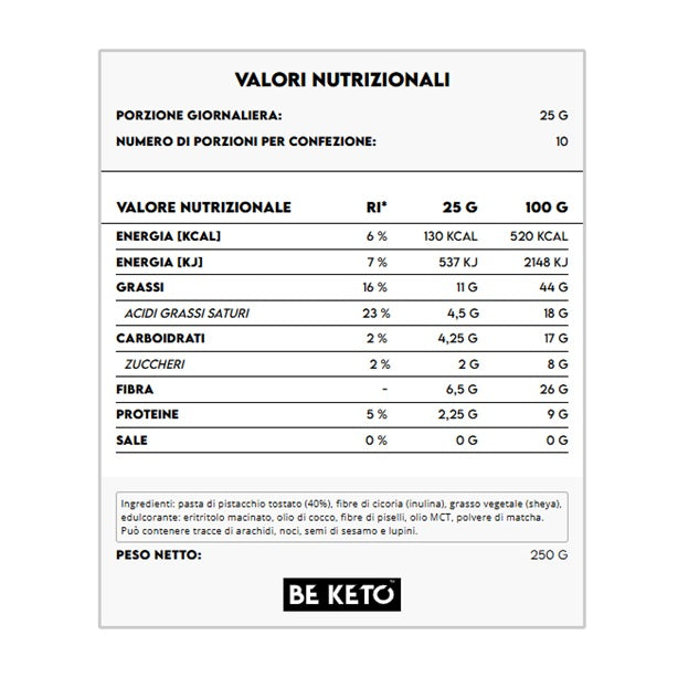 Crema Keto – Regina Pistacchio è una crema speciale creata per gli amanti delle pistacchi e dello stile di vita sano. Contiene meno di 5 g di carboidrati netti per porzione ed è una fonte eccellente di fibre e grassi sani. La sua composizione si basa su una pasta di pistacchio tostato ed è arricchita con matcha, una fonte naturale di antiossidanti che supportano l’organismo. Grazie al contenuto di inulina e MCT, la crema ha un effetto positivo sul metabolismo, fornisce una sensazione di sazietà e si adatta perfettamente a una dieta chetogenica o a basso contenuto di carboidrati.