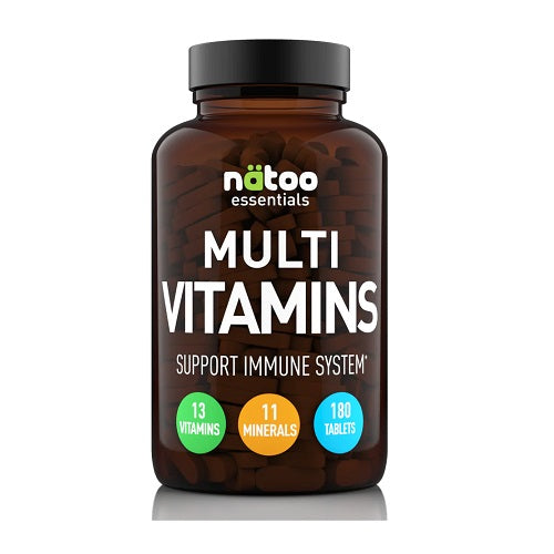 Multi Vitamins di Natoo Essentials è un integratore di vitamine e minerali che contiene ben 13 Vitamine e 10 Minerali. La sua formulazione ti aiuterà ad integrare l'alimentazione con una dose aggiuntiva di tali nutrienti, per mantenerti in perfetta forma. I numerosi effetti benefici degli ingredienti attivi di Multi Vitamins comprendono contrasto a stanchezza e affaticamento (vitamine C e B6), il contributo ad un normale metabolismo energetico (vitamine C, B6 e B12), il contributo al mantenimento di ossa normali (vitamina D, zinco, calcio e magnesio), oltre a numerosissimi altri effetti positivi sulla salute.