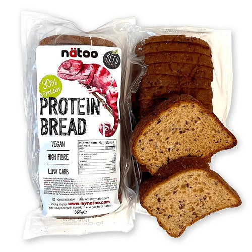 Protein Bread 30% di Natoo è un pane vegano ad elevato contenuto di proteine e a ridotto contenuto di carboidrati. È ricco di fibre e contiene Omega-3 e Omega-6. Squisito e soffice ideale per le diete chetogeniche e low carb a basso tenore di carboidrati, può essere utilizzato al posto del pane comune per arricchire la dieta di proteine. Perfetto per preparare sandwich proteici, come base per spalmare creme proteiche o burro di arachidi, anche per una prima colazione ricca di proteine. Protein Bread 30% di Natoo è un pane proteico low carb soffice e fragrante grazie alle farine di segale, di farro e di orzo che gli conferiscono il suo gusto caratteristico. È inoltre arricchito con semi di lino, girasole e di sesamo per un apporto di omega-6 e omega-3.