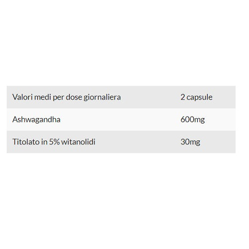 KSM-66® [Ashwaghanda (Withania somnifera (L.) Dunal, radice) estratto secco], capsula vegetale (agente di rivestimento [idrossipropilmetilcellulosa]), agente di carica (cellulosa), agenti antiagglomeranti (biossido di silicio, sali di magnesio degli acidi grassi).