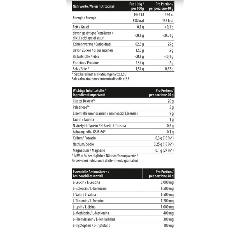 Potenzia il tuo allenamento con il Charger, il partner definitivo per l'allenamento intra-sessione. Vivi un'energia costante, previeni il dolore muscolare e prolunga la tua sessione di allenamento. Ingredienti di alta qualità come Cluster Dextrin™, Palatinose™ e aminoacidi essenziali assicurano una potenza duratura. Taurina, N-Acetyl-L-Tirosina e Ashwagandha KSM-66® potenziano anche la tua resilienza mentale. Porta il tuo allenamento a un livello superiore oggi con Charger.