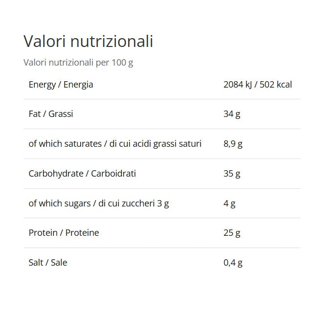 Edulcorante: maltitolo; proteine del siero del latte, olio vegetale (shea), olio di girasole, farina di soia, latte in polvere, cacao magro in polvere, emulsionante: lecitine (soia); sale, aroma.